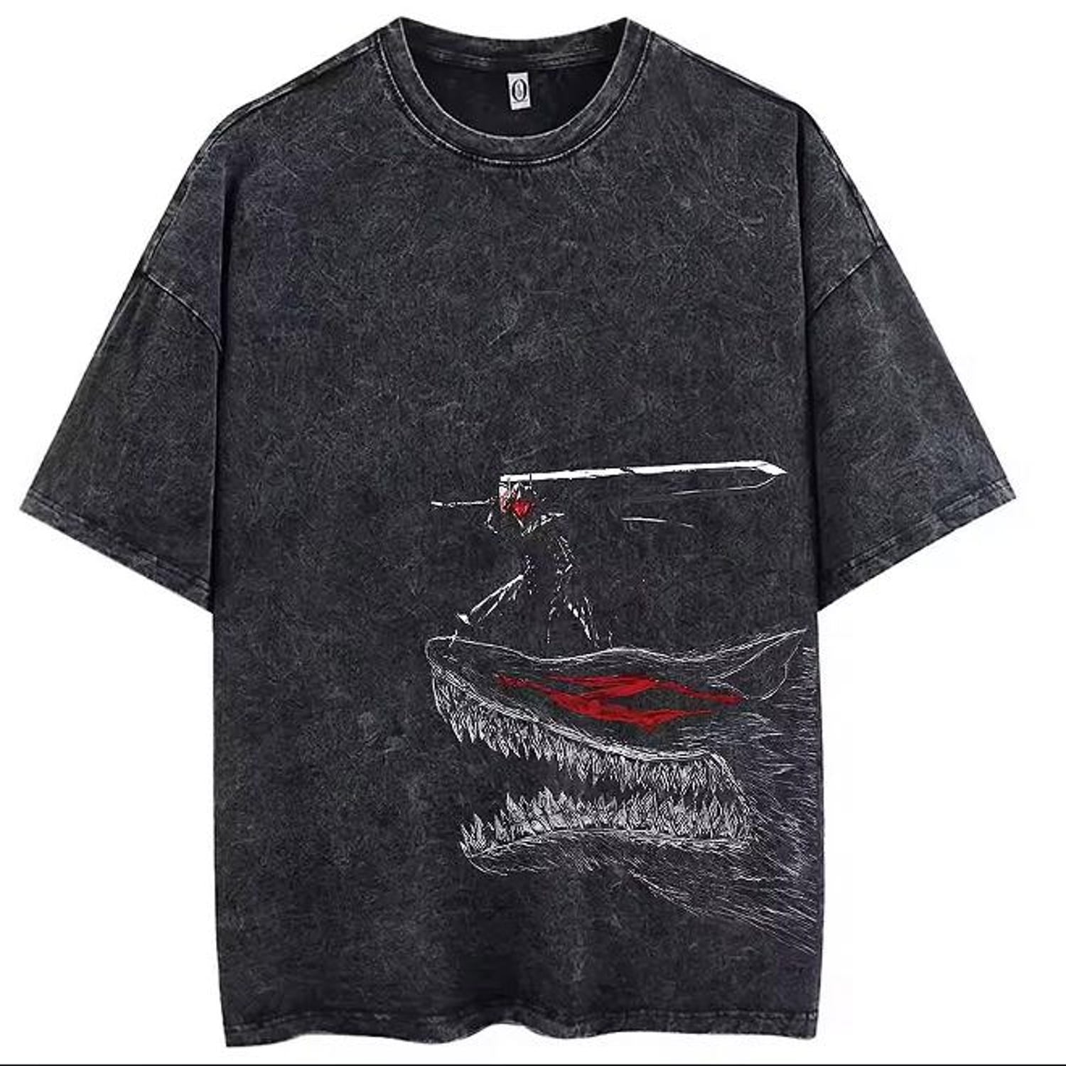 Vintage Washed Finish: The charcoal black wash gives this tee a rugged, aged appearance, perfectly matching the harsh world of Berserk.