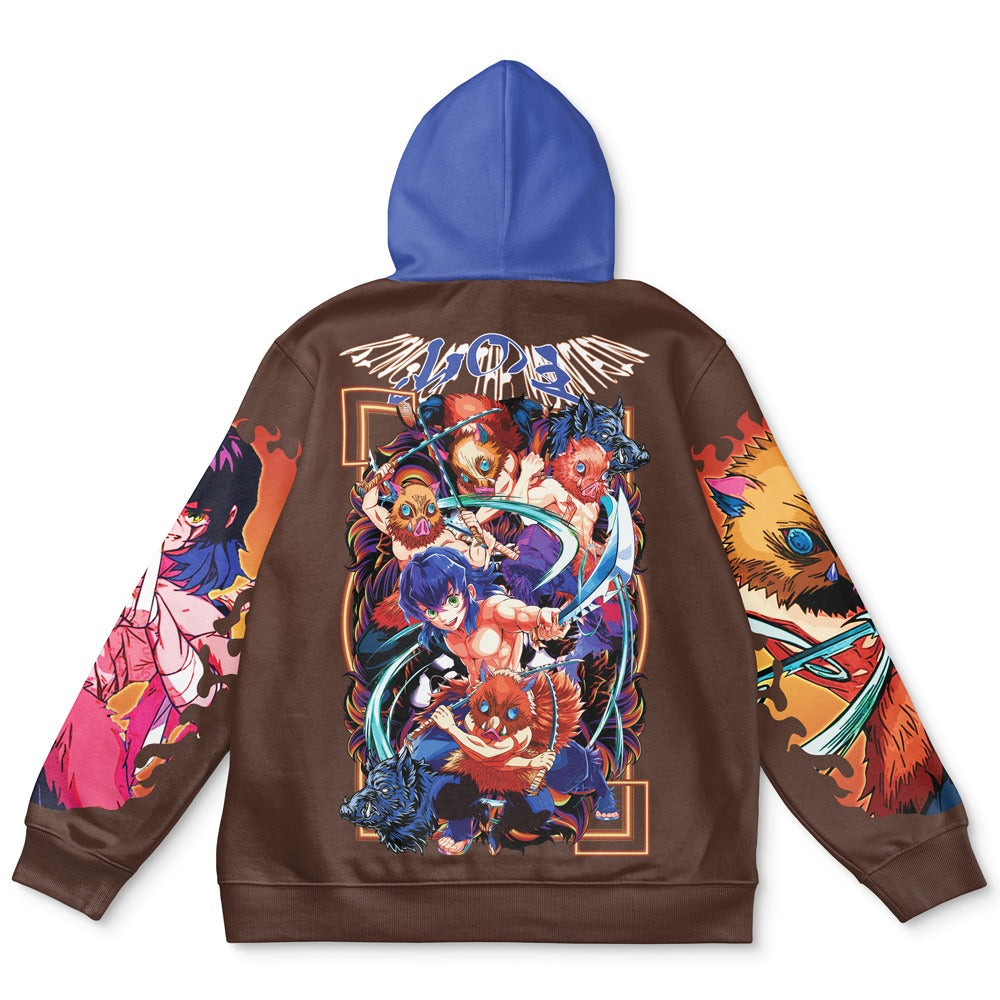Unleash your untamed spirit with the Otakuri "Inosuke Hashibira (Beast Breathing)" Demon Slayer Streetwear Hoodie. Inspired by the fearless warrior raised in the wild, this hoodie captures Inosuke’s raw energy and fierce presence. The back features a dynamic illustration of Inosuke wielding his serrated dual blades alongside his iconic boar mask, radiating power and ferocity.