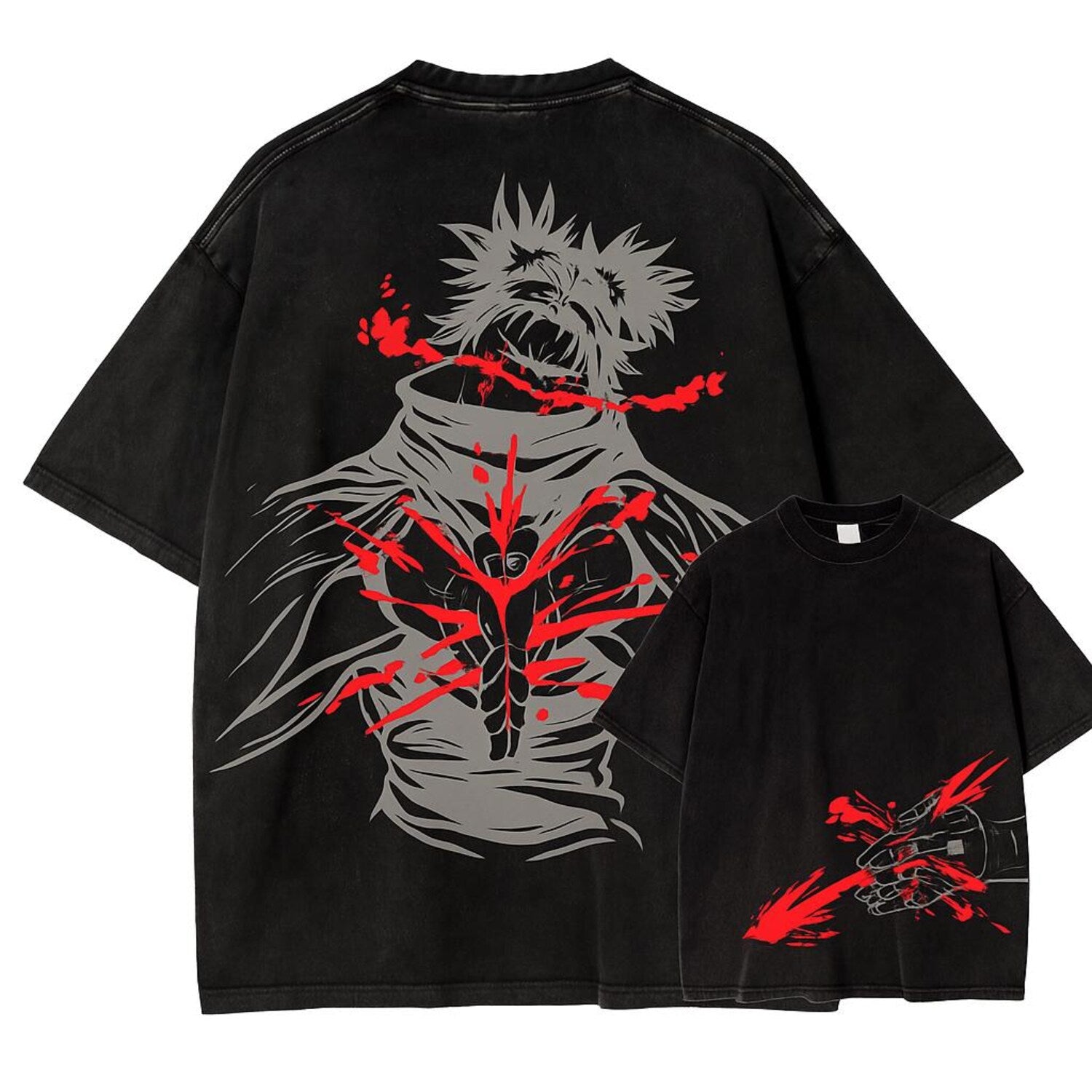 Explosive Graphic: The back features a large, dramatic print showing an explosion of Red Cursed Energy radiating from the core of the sorcerer (Gojo/Yuta style). The front has a subtle symbol, perfect for a clean look.