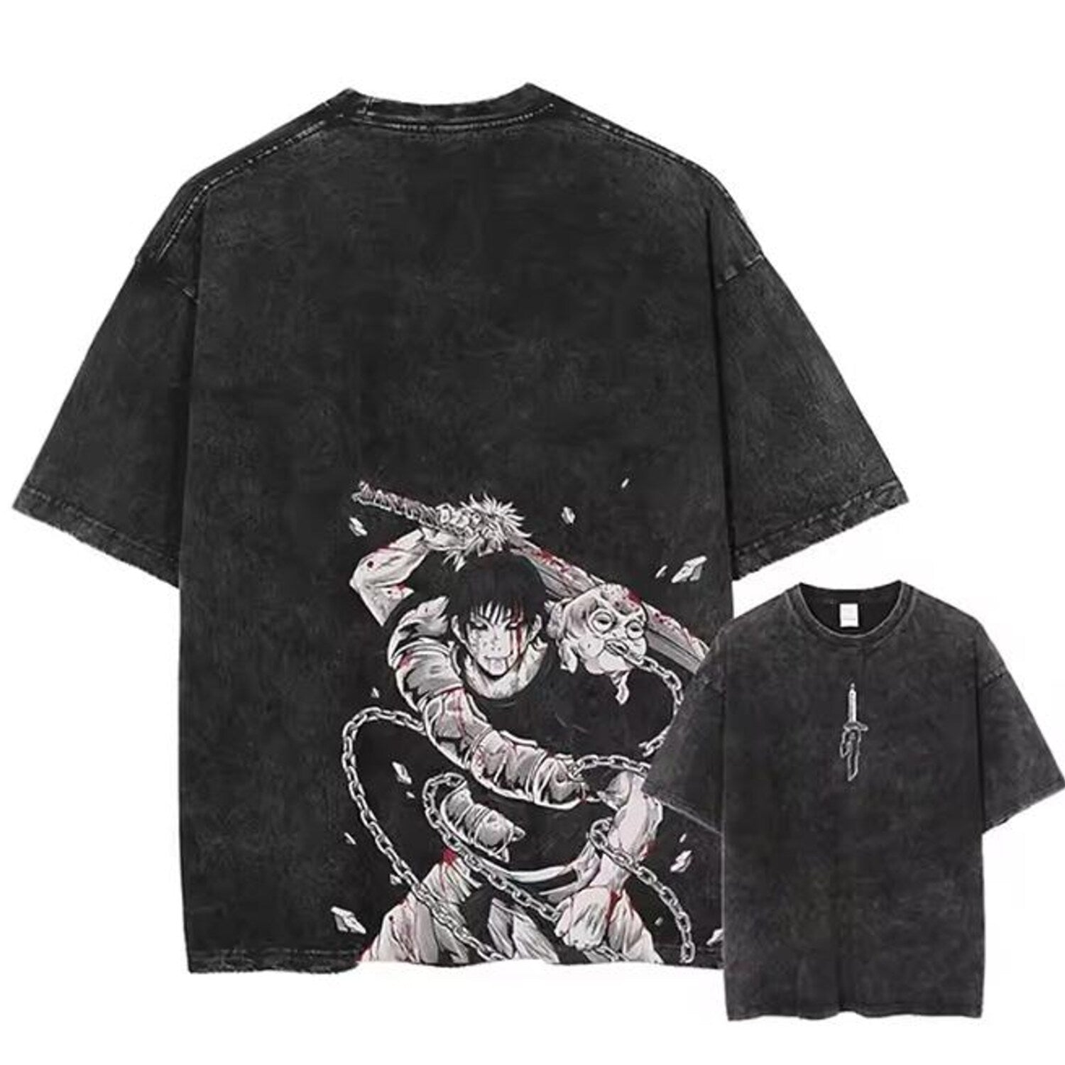 Dominating Graphic: A large, powerful back print showcases Toji Fushiguro in a dynamic combat pose, complete with his iconic Cursed Tool and chains. The front features a subtle dagger graphic for a complete look.