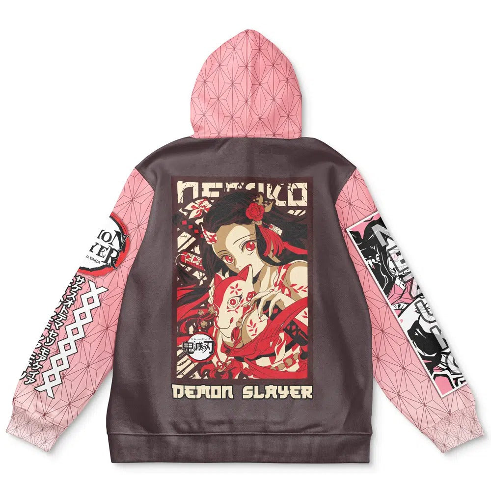 Unleash your inner anime spirit with the Otakuri "Nezuko (Fox Mask)" Demon Slayer Streetwear Hoodie. Designed for true fans of Demon Slayer: Kimetsu no Yaiba, this hoodie features a bold back print of Nezuko holding her iconic fox mask, symbolizing her strength and mysterious charm. The sleeves are detailed with striking pink geometric patterns inspired by her kimono, paired with powerful typography and manga-style accents that make this piece stand out.