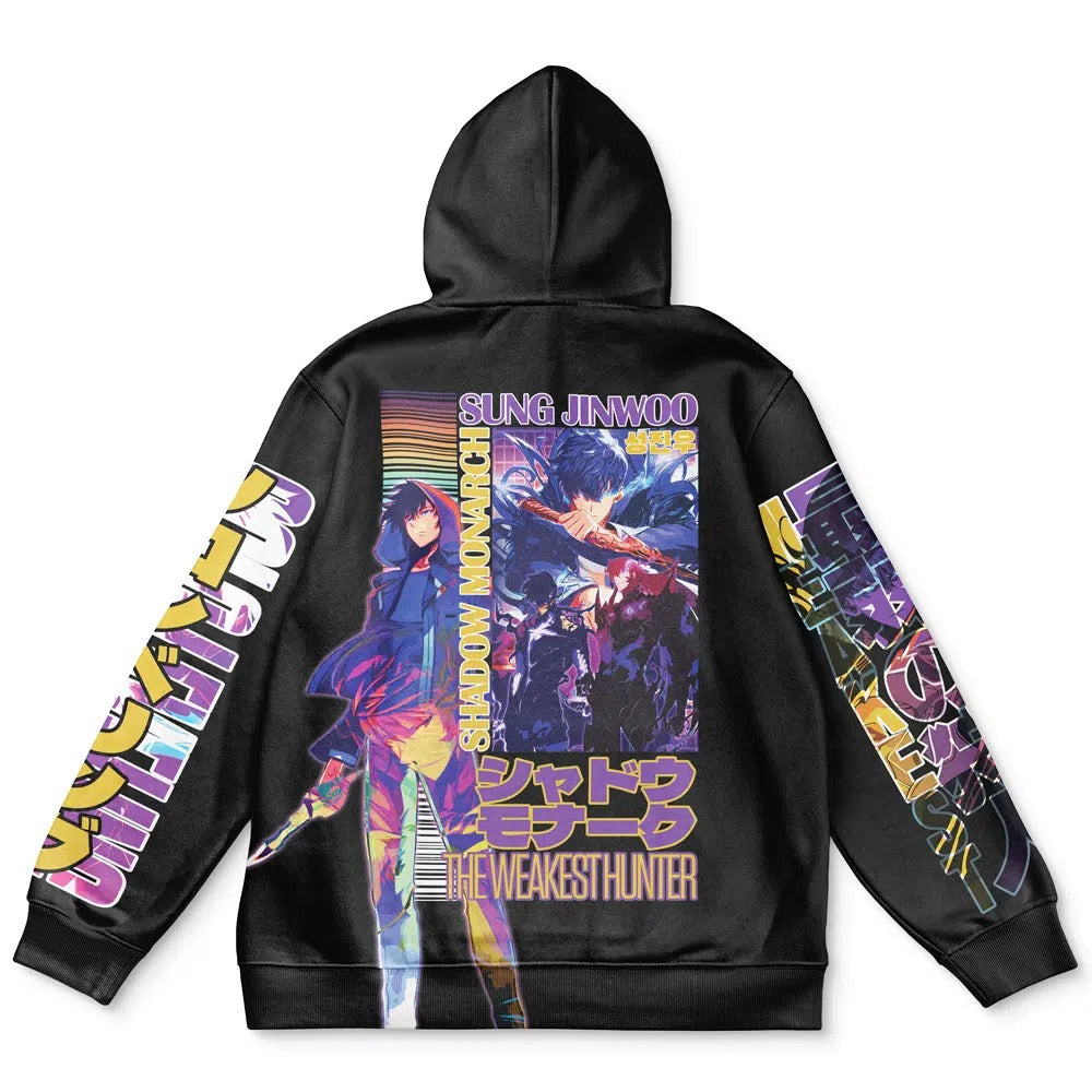 Step into the legendary journey of the world’s weakest hunter turned Shadow Monarch with the Otakuri "Sung Jinwoo (Shadow Monarch)" Solo Leveling Streetwear Hoodie. This premium hoodie celebrates Jinwoo’s transformation, from struggling hunter to commanding force, captured in electrifying detail across the back. The design showcases Jinwoo in his iconic stance, flanked by manga-style artwork and vivid tones that highlight the intensity of Solo Leveling.